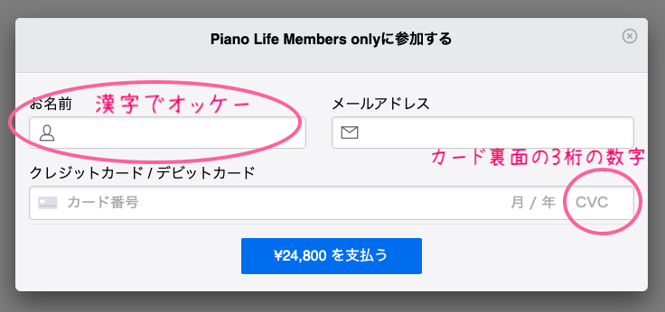 お名前、メールアドレス、カード情報をご記入の上お申し込みください。お名前のところには、漢字でお名前をご記入ください。CVCはセキュリティコード(クレジットカードの裏面に記載されている3桁の数字)をご記入ください。