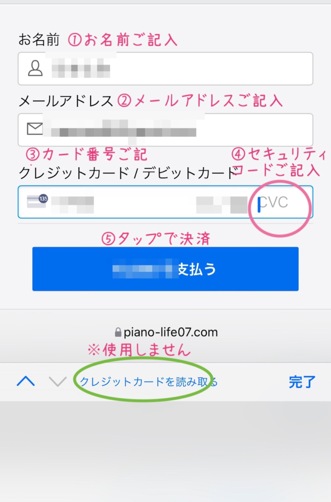 スマホからお申し込みの際、決済画面が以下のように出ます。緑の丸◯の「クレジットカードを読み取る」の部分は使用せずに、カード情報を記入した後、⑤の決済をタップしていただければ完了します。